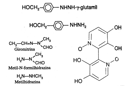 Agaricus bisporis es un hongo comestible, que contiene 0,3% de agaritina (glutamil-4-hidroximetilfenilhidrazina) que también es un derivado de hidrazina. Toth y Erikson (1977) describieron los efectos tóxicos, convulsivos y letales. Asimismo, propusieron que podía ser antagonizado mediante la administración preventiva y terapéutica de clorhidrato de piridoxina. Agaricus bisporis posee también una enzima del tipo de glutamil-transferasa, tal que se cuenta con la liberación de 4-hidroximetilfenilhidrazina (Fig.4).