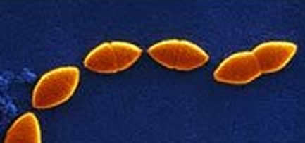 < Streptococcus pneumoniae: diplococos gram positivos de forma lanceolada. Pueden presentar cápsula.
