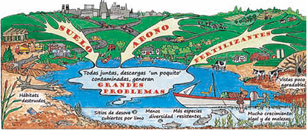 • Figura 1. Diagrama de contaminación en los cuerpos de agua y sus consecuencias. Tomado y adaptado de Wisconsin Water Resources Clip Art Collection (http://clean-water.uwex.edu/pubs/).
