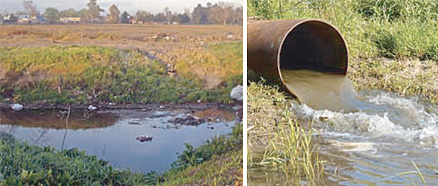 • Figura 2. (a) Imagen de la cuenca Matanza-Riachuelo en el tramo que atraviesa la localidad de Ezeiza (gentileza de Iara Rocchetta); (b) desembocadura de efluentes cloacales en un tramo del río Reconquista que atraviesa la localidad de Moreno (http://naturalezademoreno.blogspot.com.ar).