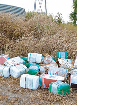 • Figura 3. Envases de pesticidas utilizados en campos en la provincia de Entre Ríos, desechados al costado del campo donde se aplicaron (gentileza de Gerardo Cueto).