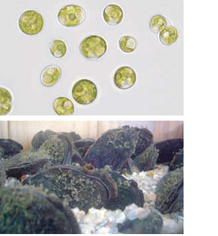• Figura 5. Imágenes de algunos de los modelos de estudio empleados en el LEEM: (a) microalgas de agua dulce, Scenedesmus vacuolatus, (b) almeja de agua dulce, Diplodon chilensis (gentileza de María Soledad Yusseppone)