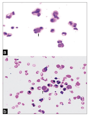 1- Preparación de Cytospin del líquido pleural que muestra células en tarta (MGG, × 400). |