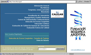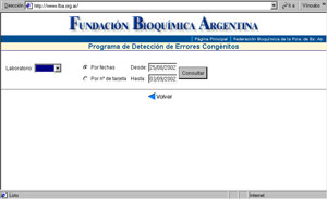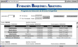| A mediados de junio de 2002 fue habilitada la página Web de Fundación Bioquímica Argentina (www.fba.org.ar) para la consulta ON-LINE de resultados del Programa de Detección de Errores Congénitos. Para poder acceder a dicha consulta se deberá ingresar a dicha página Web para solicitar un código de usuario y una clave que habilitará para el acceso personalizado a los resultados. (Figura 1). ![]() Una vez completado este requisito podrá accederse a una opción exclusiva para usuarios registrados en la cual podrá efectuarse la Consulta de Tarjetas. (Figura 2). ![]() Dicha consulta podrá realizarse tanto por fecha de ingreso de la muestra como por número de tarjeta (Figura 3), siendo posible efectuar no solamente la consulta en pantalla, sino también imprimir los resultados a través de un botón especial denominado "Versión para imprimir". (Figura 4). ![]() Del mismo modo podrán consultarse los métodos utilizados a través de otro botón especial denominado "Visualizar métodos". (Figura 4). ![]() La actualización de la información en la Web será realizada dos veces por semana, fijándose para los días martes y jueves. Envío de resultados por vía electrónica Otra de las áreas en las que se está trabajando intensamente es en la generación de un sistema para el envío electrónico de resultados bajo la forma de planilla. Este sistema, que será habilitado próximamente, permitirá la recepción electrónica de resultados en aquellos laboratorios que cuenten con correo electrónico. Por esta razón resulta necesaria que todos aquellos laboratorios interesados en recibir los resultados por esta vía y que aún no nos han aportado su dirección de e mail lo realicen a la brevedad utilizando el formulario que se proveyera oportunamente o por correo electrónico dirigiéndose a erroresc@fbpba.org.ar. |