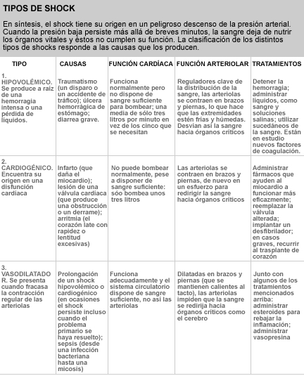 La clasificación de los distintos tipos de shock responde a las causas que los desencadenan. Son diversas. Uno de los más frecuentes, el shock hipovolémico se produce por una caída brusca del volumen sanguíneo. Ello ocurre, por ejemplo, cuando un traumatismo o una úlcera de estómago provoca una fuerte hemorragia o cuando una diarrea grave drena los líquidos del organismo. El corazón bombea demasiada poca sangre en cada latido y, aunque intenta compensar la bajada de presión mediante un incremento del ritmo, no lo consigue: la presión arterial cae y los tejidos quedan sin alimento. Cuando se trata de un shock hipovolémico, del que se producen millares cada año, los médicos se esfuerzan por parar la hemorragia o la pérdida de otros fluidos mediante la transfusión de sangre, la infusión de una solución salina o ambas medidas a la vez, para compensar así el volumen del líquido que el organismo ha perdido. Los investigadores buscan nuevas formas para detener la hemorragia: aplicar una sustancia que aumente la coagulación o utilizar sucedáneos de la sangre si falta ésta en cantidad suficiente.