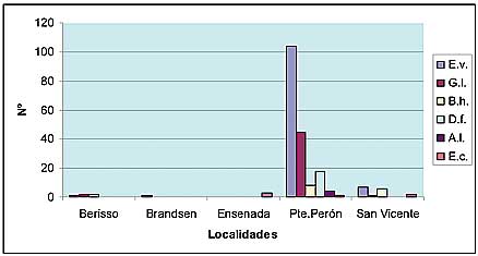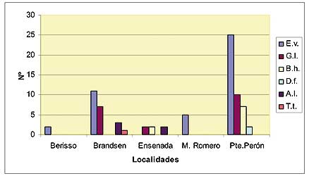 En las localidades de Brandsen y Presidente Perón se ha detectado una mayor variedad de especies parasitarias. Durante el período evaluado, el 83,5% de las parasitosis halladas corresponden a estas localidades, según se consigna en la tabla1.