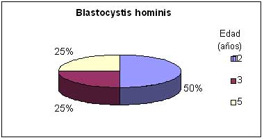 En relación a Blastocystis hominis la infección por este protozoo se limitó a niños de muy corta edad: 50% en niños de 2 años y 25% hasta los 5 años.