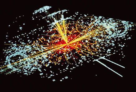 • Una traza hipotética del bosón de Higgs en una colisión simulada de protón-protón. Foto CERN. Lucas Taylor 1997.