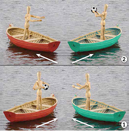 • Los dos botes como representación esquemática de la interacción por intercambio de partículas mediadoras