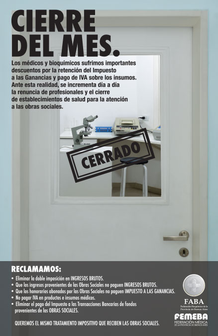 Las entidades representantes de bioquímicos y médicos – FABA y FEMEBA – se propusieron dar a conocer esta situación de excesiva presión tributaria a través de una campaña de difusión a través de diversos medios radiales y gráficos cubriendo gran parte de las localidades de la provincia de Buenos Aires. FABA en forma conjunta con FEMEBA ha encarado una campaña de reclamo ante la presión impositiva que sufren los bioquímicos, médicos y sanatorios de la Provincia de Buenos Aires, que se hará efectiva a través de avisos publicitarios en diarios, periódicos y radios en los partidos de la Provincia de Buenos Aires y la colocación de afiches en los laboratorios bioquímicos y consultorios médicos de la Provincia.