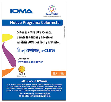 "Todos los laboratorios de la red de FABA deberían tener colocado en la sala de espera el afiche del programa para favorecer su difusión, y concientizar a los pacientes, afiliados al IOMA de entre 50 y 75 años de edad, de la importancia de realizarse el test preventivo (SOMF) una vez al año. Creemos que depende de cada bioquímico en su laboratorio, y tanto de FABA como de los Distritos brindando todo el apoyo necesario, para que el programa sea un éxito".
